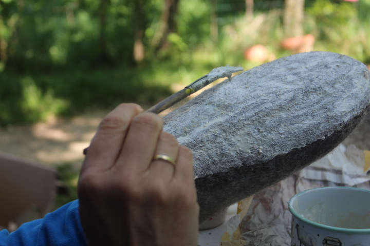 Zurzeit brennt im Kanonenofen draußen nicht nur Feuer, um das Spülwasser aufzuheizen. Normalerweise benützen wir zum Waschen unserer Wäsche unsere richtige Waschmaschine, aber wenn im Winter Strom fehlt, dann sind wir froh über jede Wattstunde, die wir sparen können. Der Nachbar einer Kollegin von Bettina hat uns deshalb an eine alte Waschmaschine eine Handkurbel gemacht. Da müssen wir jetzt nur noch heißes Wasser reinkippen und drehen. Coole Sache! Also, jetzt ist der Winter endgültig vorbei, würd ich mal sagen. Überall schafft's und summt's und zwitschert's, dass es mir eine helle Freude ist. Aber wie klein das ganze Leben noch ist, die ganzen Samen und Körner und Fallschirmchen, die der Wind in der Luft herumwirbelt! Im Gemüsegarten leg ich dieses wilde Werden an die ordnende Leine. Die Pflanzen, die in ihren Töpfen schon größer geworden sind, dürfen jetzt in den neuen Folientunnel. Die Kartoffeln haben in Bettinas Atelier schon stattliche Triebe bekommen. Ich hab einen unbewirtschafteten Teil des Gemüsegartens gemäht und Hühnermist vom letzten Jahr drauf verteilt. Dann hab ich vorisichtig, um die Triebe nicht zu beschädigen, zweihundertsechsundsechzig Kartoffeln auf die Fläche gelegt. In der Scheune haben ein paar alte Heuballen nur Platz weggenommen. Jetzt haben sie endlich ihre Bestimmung gefunden! Schönes Landleben! Das ist unser Kaffee: Bettina hat im letzten Sommer Zichorie angepflanzt und geerntet. Im Winter hat sie die großen Wurzeln der Pflanzen gewaschen. Dann hat sie die gewaschenen Wurzeln geraspelt, getrocknet und auf dem Ofen im Atelier in einer gußeisernen Pfanne geröstet. In einer "Kaffee- und Gewürzmühle" hat sie die groben Stücke ganz fein gemahlen. Jetzt muss die Probe noch kommen, ob das auch wirklich schmeckt wie Kaffee. Jedenfalls finde ich, aussehen tut's schon mal wie Kaffee. Ich bin so überrascht gewesen, als ich gesehen hab, dass der letzte Stückles-Letter schon eine Woche her ist. Es fühlt sich eher an wie ein paar Tage. Die Zeit ist grad so voll, Vor allem die Bienen und der Garten. Viele Pflanzen im Gewächshaus sind noch sehr klein. Aber manche sind schon etwas größer, so groß, dass ich sie von den Anzuchtschalen in größere Pflanztöpfe umziehe, wo sie immer noch geschützt sind, aber doch um einiges mehr Wurzeln bilden können. Die Samen von Karotten und Erbsen, Dill und Rote Bete kommen überhaupt nicht ins Gewächshaus, sondern direkt ins Beet, weil es schon gut warm ist. Dennoch muss ich die Erde der Beete vorbereiten. Wir haben uns einen elektrischen Grubber gegönnt. Nie mehr ohne! Eine zweite Errungenschaft ist eine richtig gute Sämaschine. Was letztes Jahr noch so lange gedauert hat, das ist jetzt nur noch ein Augenzwinkern! Ich komm vor Freude aus dem Lachen gar nicht mehr heraus! Und wenn die Karotten und die Erbsen, der Dill und die Rote Bete in der Erde sind, kriegen sie noch ordentlich was zu trinken, und hoffentlich nehmen sie das zum Anlass, kräftig zu wachsen. Heute war ein richtig heißer Tag. Da ist natürlich das Fell der Schafe viel zu lang. Deshalb hat sich der Scherer um unsere Schafe gekümmert. Bettina hat so eine Freude an der Wolle! Sie hat gleich den Waschkessel angeheizt und die Wolle gewaschen. In das heiße Wasser hat sie Zwiebelschalen getan. Das färbt Wolle wunderschön rotbraun. Zurzeit ist alles "Garten". Bettina sagt, ich soll auch mal Pause machen. Aber jetzt ist die Zeit. Bald kommen die Kohlfliegen. Und deshalb hab ich JETZT ein Kohlnetz gemacht. Ich finde, jedes Jahr wird es besser. Dieses allerdings hat noch keinen Sturmtest absolviert. Wir werden sehen... Manche Pflanzen muss ich gar nicht vor Schädlingen retten, sondern vorm Regen. Die Tomaten vertragen Regennässe nicht so gut, weil sie sonst gerne Krautfäule kriegen. Deshalb hab ich den Folientunnel hergerichtet. Da hat mir mein neuer Grubber mordsmäßig geholfen! Natürlich retten wir nicht nur Pflanzen sondern auch Tiere. Allerdings leider nicht alle. Von zwölf Entenküken sind noch zwei übrig. Aber eines davon hat Bettina gerettet. Es ist in den Brunnen gefallen und war schon ganz kalt. Jetzt geht es ihm aber wieder richtig gut. Bettina hat gemeint, es ist wie so ein kleines, fiepsendes Luftkissenboot aus einem Comic, wenn es in der Gegend rumdüst: von der Wiese rein in die Wasserwanne, schwupps! durchgepaddelt, wieder raus in die Wiese und unter die Flügel von der Mami. Bettina ist heute weg, ein paar Kollegen zu zeigen, wie man filzt. In den letzten Wochen hat sie sich richtig toll eingearbeitet in dieses Kunsthandwerk. Zu allererst hat sie die frisch geschorene Wolle in einem großen Zuber gewaschen. Da ist echt alles Mögliche drin. Wenn die Wolle sauber ist, breitet Bettina sie in der Sonne zum Trocknen aus. Hier ist es sogar gefärbte Wolle. Ich glaube, das schöne Gelb kommt von Zwiebelschalen, aber ganz sicher bin ich nicht. Und daraus sollen Hausschuhe werden? Aber mit heißem Wasser, Kernseife und viel kräftiger Handarbeit kommt sie der Sache Schritt für Schritt näher. Über's Internet hat sie solche Schusterformen für Schuhe ersteigert. Irgendwie schafft sie es, damit der Wolle zu sagen, dass sie aussehen soll wie Schuhe. Und zum Schluss kriegen die Hausschuhe einen Naturlatexanstrich, damit sie eine widerstandsfähige und rutschfeste Sohle haben. Total schön, oder? Während Bettina ihren Kollegen zeigt, wie das mit den Hausschuhen geht, haben mir ein paar Radfahrer eine riesige Schildkröte gegeben. Beim Bauwagen keckern grad immer die Elstern, weil Selma die Nester so interessant findet. Sie hat allerdings noch keines der kleinen, fiepsenden Vögelchen erwischt. Wenn es regnet allerdings ist sie vor allem im Bauwagen und tyrannisiert die beiden Hunde. Weil unsere liebe Freundin Muthe eine Katzenallergie hat, konnten wir nicht zusammen in den Bauwagen sitzen und raus auch nicht. Aber wir haben eine Zwischenlösung gefunden: Der Folientunnel ist auch bei Regen trocken und sogar ein bisschen warm! 
